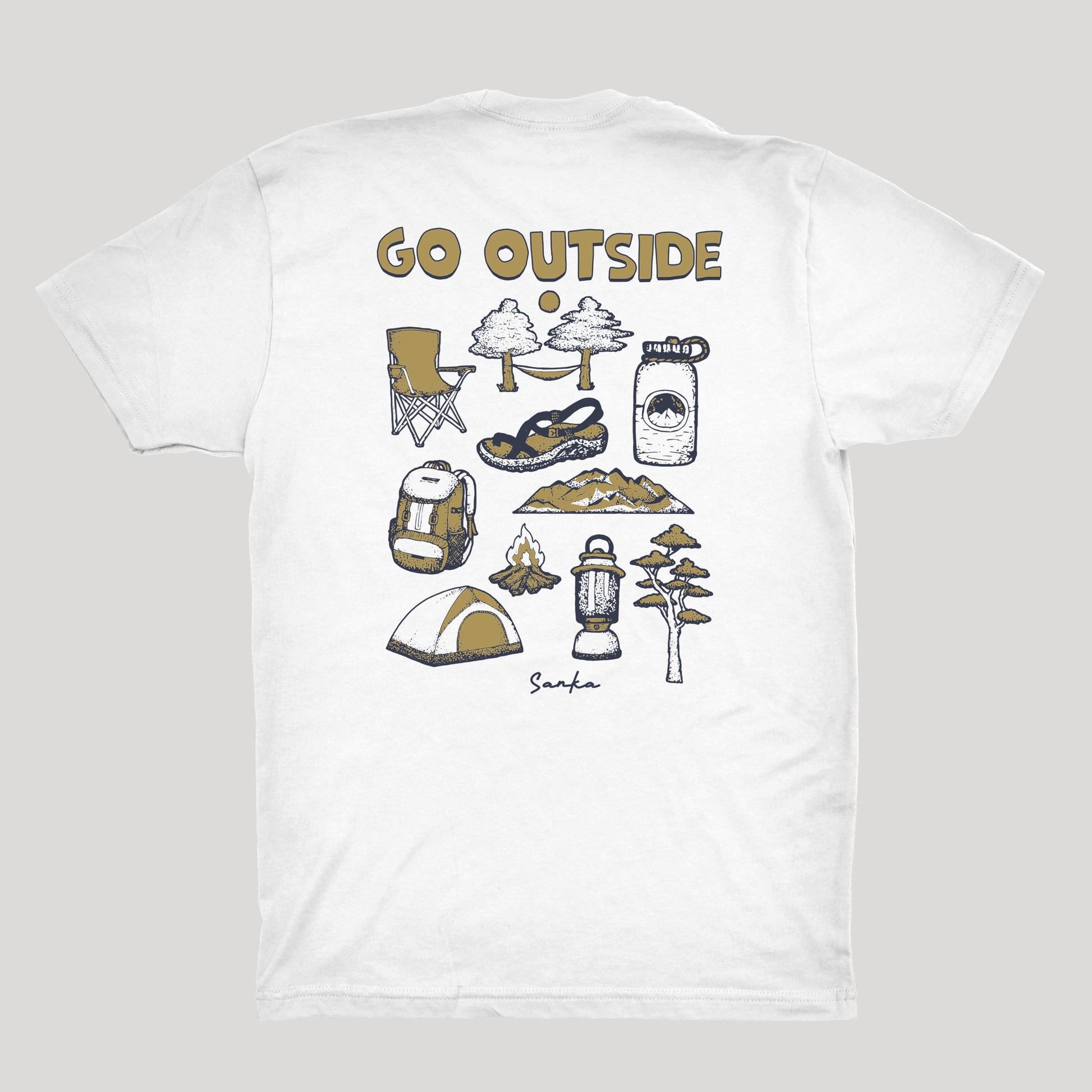 The essential camping shirt! Sanka's GO OUTSIDE T-shirt is made of 100% cotton. Only available in white.